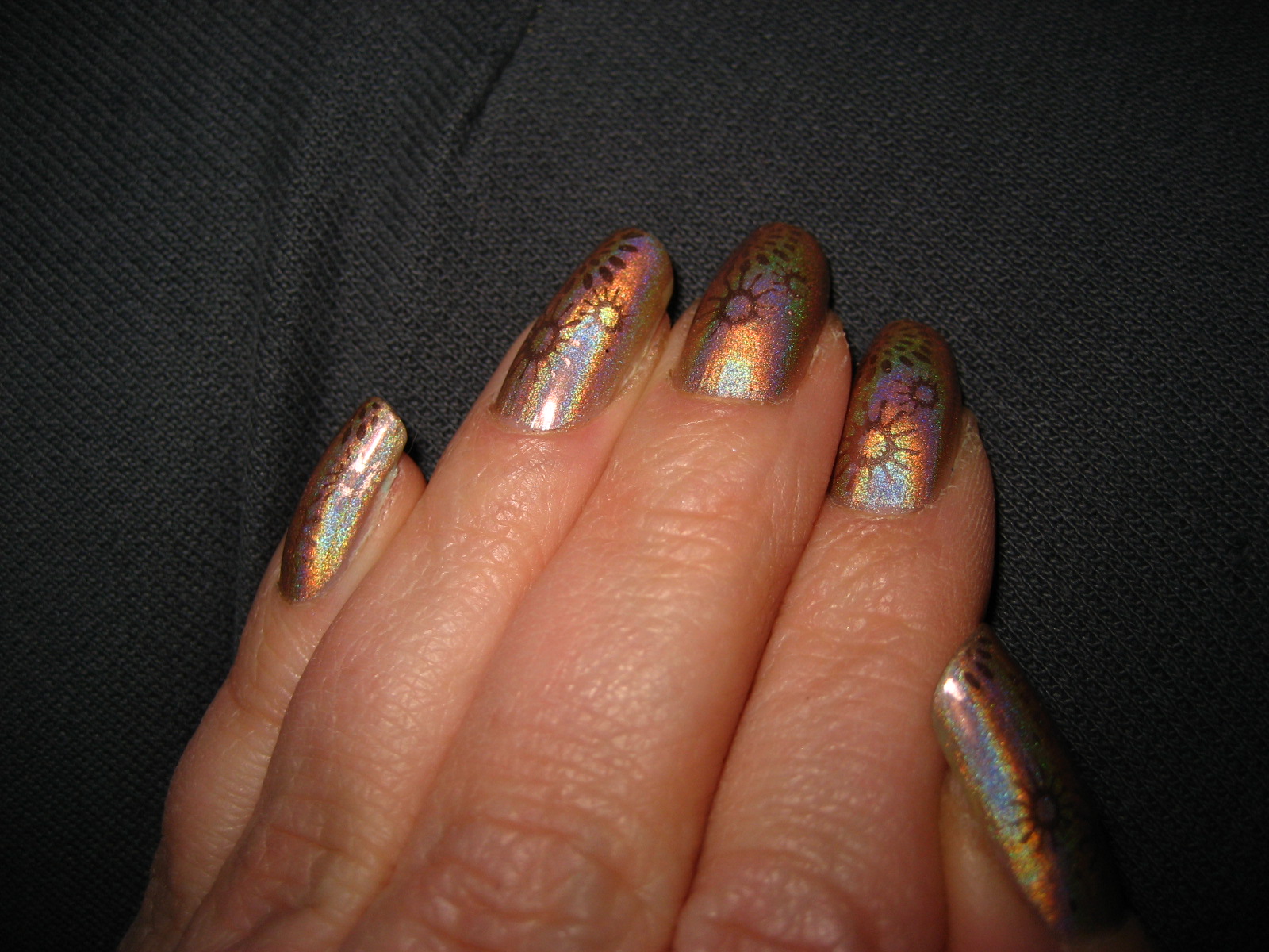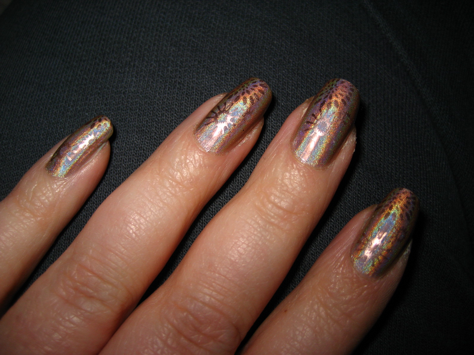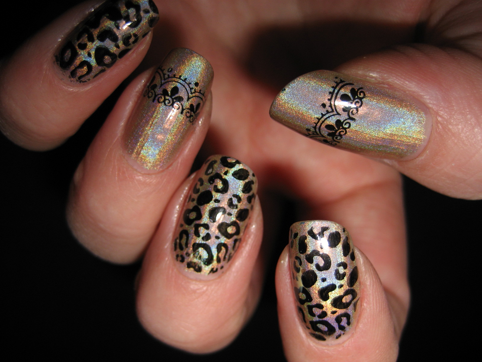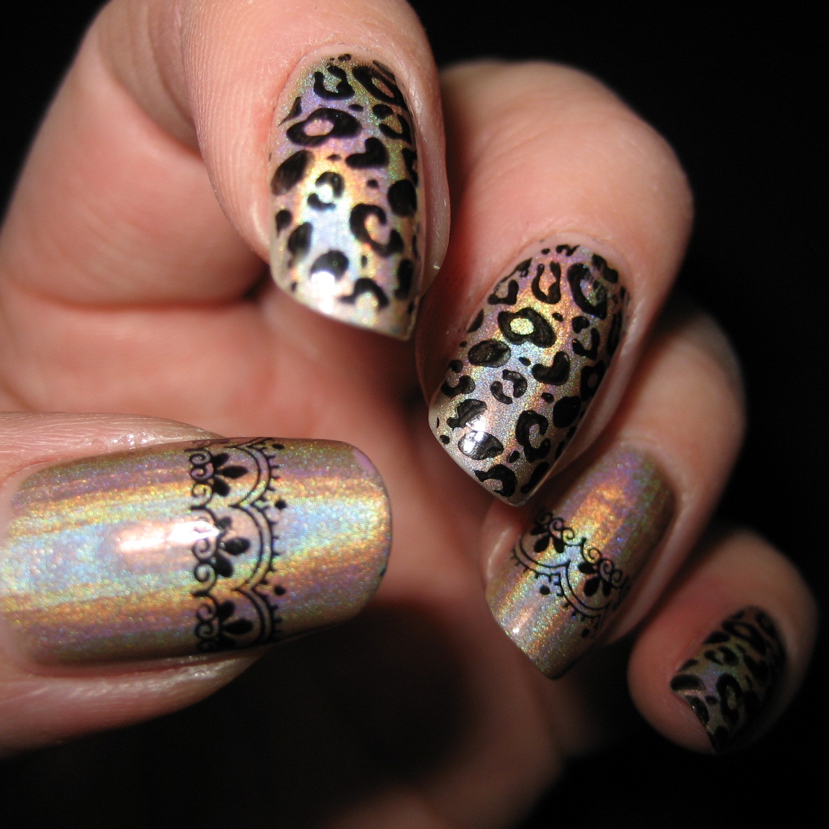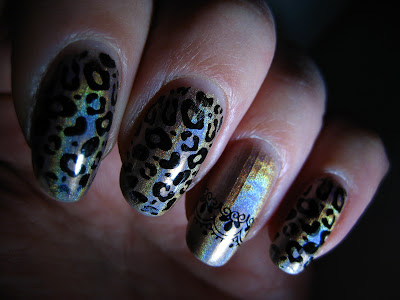 Printed with a random black polish using Konad Image Plate M57