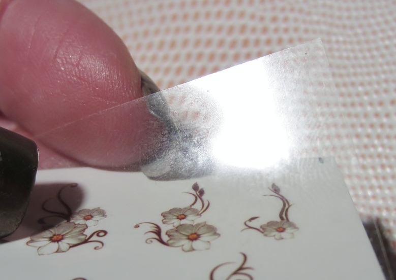 water decal stuck to it and put it on the nail. Rub the film so that the decal